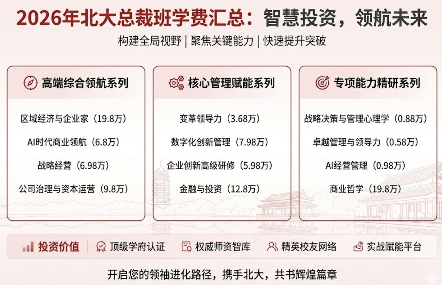 在知识经济与数智化浪潮奔涌的时代,企业家与高层管理者的持续学习与认知迭代,已成为企业穿越周期、基业长青的核心引擎。北京大学,作为中国高等教育的璀璨明珠,始终致力于为商界领袖提供最前沿、最系统、最具深度的思想赋能平台。2026年,北大面向企业家群体精心打造了多层次、多维度的总裁研修课程体系,旨在满足不同发展阶段、不同战略聚焦的领导者需求。了解这些顶级课程的学费投入,不仅是衡量教育成本的标尺,更是洞察其价值深度与回报潜力的关键一步。本文将为您清晰梳理,助您做出最明智的智慧投资决策。