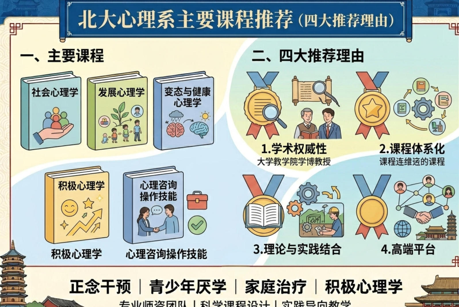 2. 课程体系化 :北大心理系的课程设置科学系统,涵盖了心理学的核心领域和前沿动态。从社会心理学、发展心理学到变态与健康心理学、积极心理学,再到心理咨询操作技能,形成了完整的课程体系,确保学员能够全面掌握心理学知识和技能。