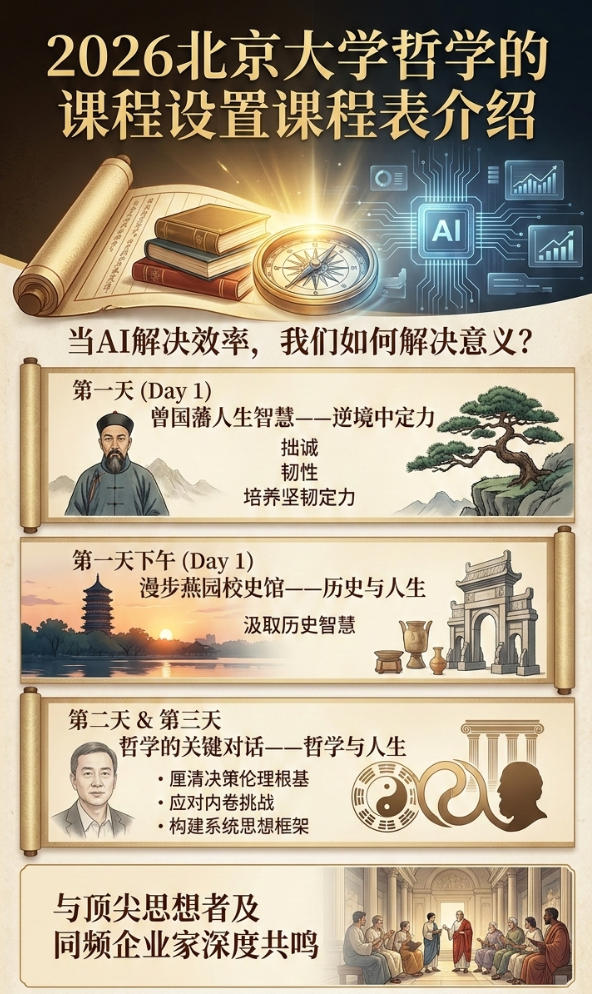 北京大学管理者哲学共修计划高级研修班将于2026年3月24日在北京开课,学费为9600元/人,含学费、资料费、场地费、结业证书(交通、食宿费用自理)。这是一次难得的思想盛宴,一次心性的修炼,一次领导力的升华。